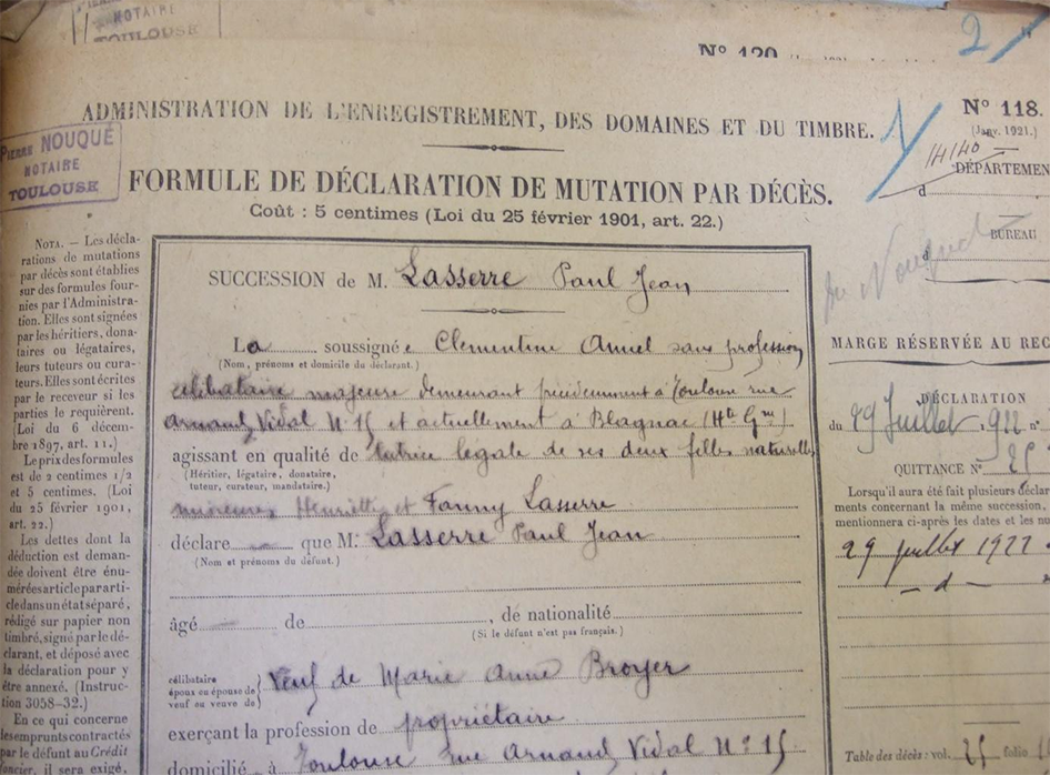 Les trois documents concernant la succession de Paul LASSERRE sont consultables aux archives départementales de la Haute Garonne. La déclaration principale, signée par Clémentine AMIEL, porte en première page le tampon de l’étude de Pierre NOUQUÉ, Notaire à Toulouse qui a enregistré le testament du défunt.
