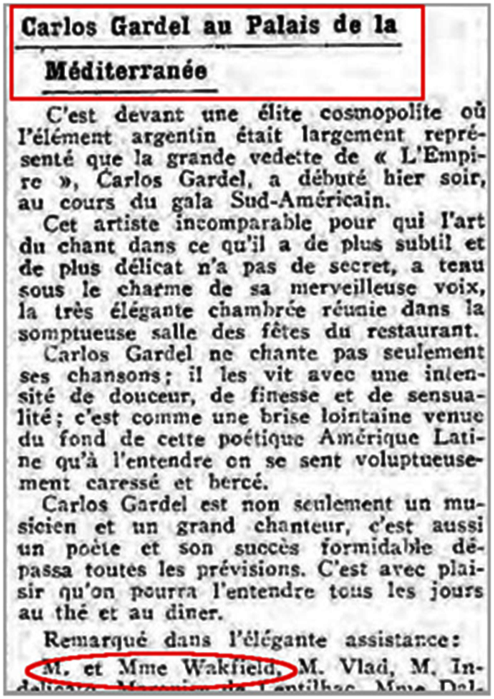 No se conoce con exactitud cuándo conoció Gardel al matrimonio Wakefield. Algunos autores se remontan su primera visita a la Costa Azul (1929), aunque no hemos encontrado nada que pueda confirmarlo. El 15 de enero de 1931 es, hasta ahora, la primera fecha en la que puede afirmarse que coincidieron en la misma sala. Por otra parte, el hecho que los Wakefield encabezaran la lista de los « elegantes asistentes » indica que estaban en primera fila y probablemente en la mesa de Frank Jay Gould, propietario del Palais de la Méditerranée.
